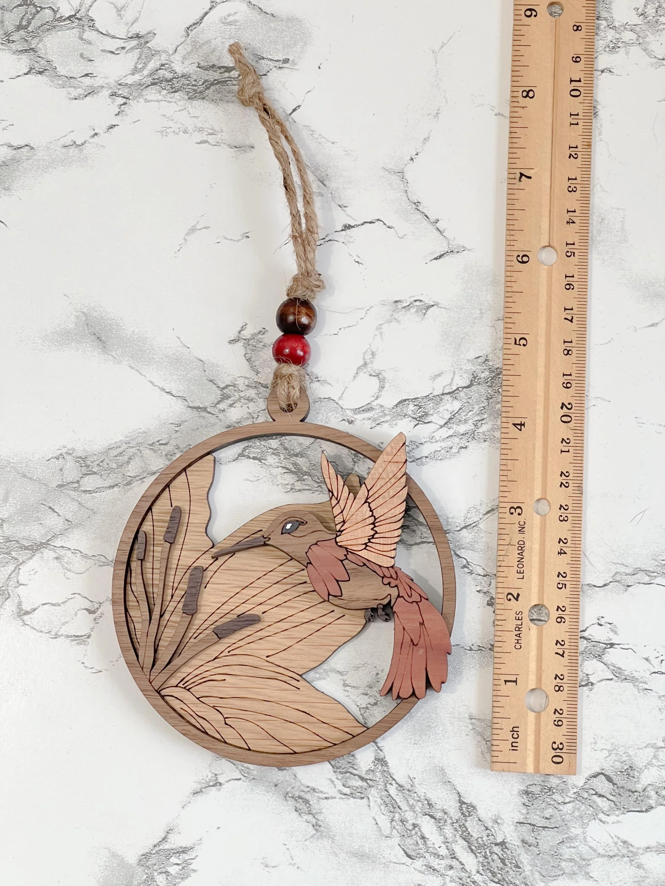 This stunning wooden ornament features an intricate hummingbird design, perfect for anyone who loves birds or unique decor. Made from veneered MDF, this piece showcases a beautiful combination of walnut, cedar, and white oak woods, giving it a rich, natural look with warm tones and varied grains.